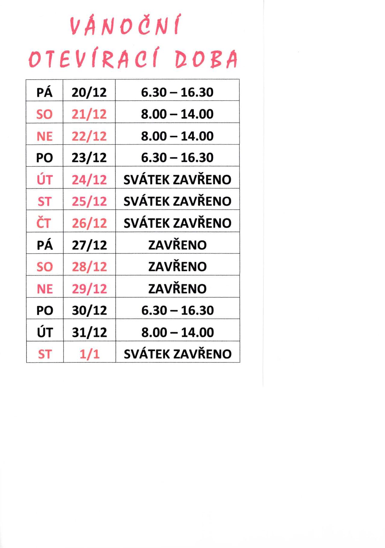 vánoční otevírací doba